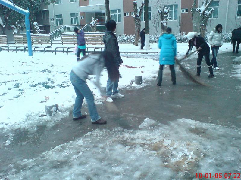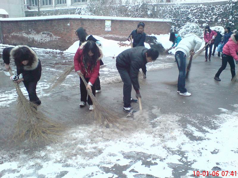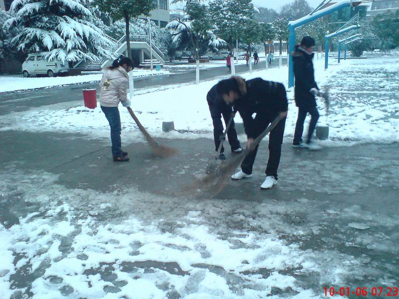 经过我系学生干部两个小时的辛勤劳动,原本铺满积雪的校园主干道,就变成了一条绿色通道”,为师生安全出行创造最佳的交通环境。