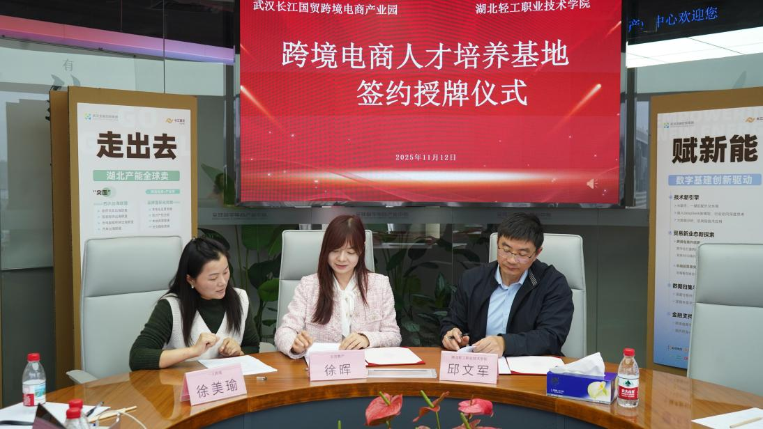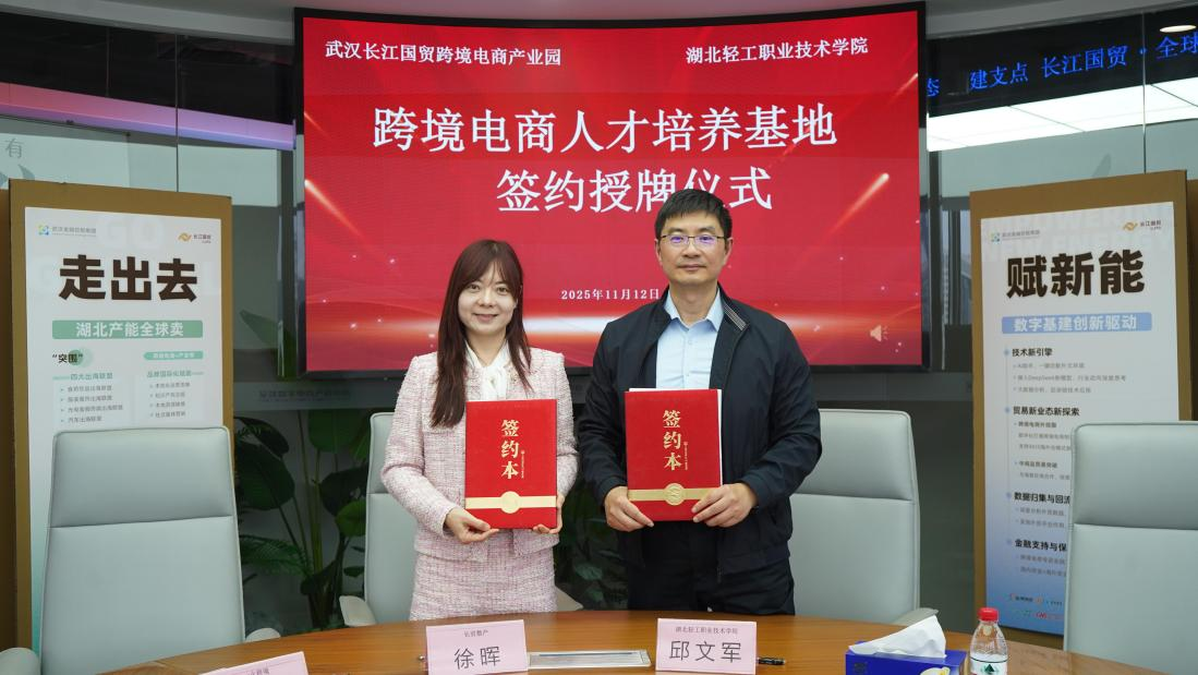 座谈尾声,在双方代表的共同见证下,邱文军院长与徐美瑜总监、徐晖经理正式签订校企合作协议。根据协议,双方将围绕课程共建、实训基地共享、师资互聘、学生定向培养等方面开展深度合作,依托长江国贸跨境电商产业园的实战平台,为学生提供沉浸式实训体验,同时为企业输送具备扎实专业技能和实战经验的复合型人才,助力湖北跨境电商产业高质量发展。