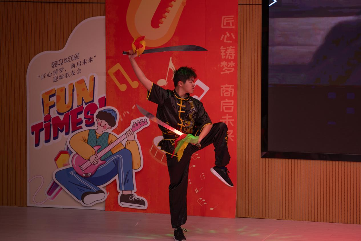 第二篇章:匠心·同行,诠释了专注、传承与陪伴的力量。机电学院张铭老师和林晖老师共同演绎《黑夜问白天》,歌声中流淌着真挚的情感。舞蹈《戏文说》与歌曲《瞬》,一舞一歌,演绎着传统韵味与时光感悟。随后,《咏春·青花瓷》的串舞将刚柔并济之美展现得淋漓尽致,而魔术表演《匠心幻影》则以奇妙的手法,致敬了精益求精的工匠精神。