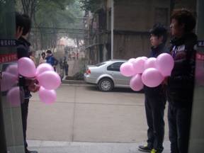 (早上7点半执勤,学生会干部给每一位女生送上粉色气球也送上粉色的祝福)