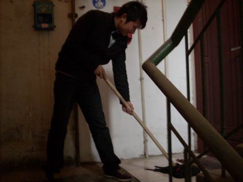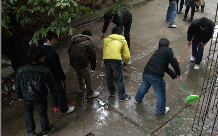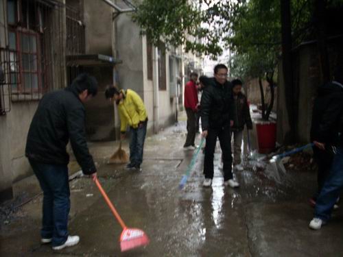 活动一开始,同学们立即拿起手中的扫帚、垃圾娄干了起来。大家争先恐后,不怕脏、不怕累,不畏严寒,虽然天空一直飘着小雨,但同学们仍坚持着,并乐在其中。经过一小时的劳动,教师住宅区变得整洁、干净,面貌焕然一新。