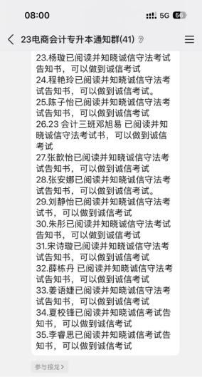 会上,班主任带领全体考生集中学习《中华人民共和国刑法》《国家教育考试违规处理办法》等涉考法律法规,明确考试违纪、作弊行为的认定标准与严厉后果,重点解读携带违禁物品、替考、传抄答案、违规使用通讯工具等行为的处罚规定,引导考生知敬畏、存戒惧、守底线。同时,结合近年来全国教育考试领域替考、内外串通作弊、手机作弊等典型案例,深入剖析违法违纪代价,警示考生切勿轻信不法机构 “助考”“包过”等虚假宣传,坚决抵制涉考诈骗与违规行为,守住诚信底线。班会最后,各班级以线上接龙的形式,集体作出诚信守法考试承诺,郑重宣誓严格遵守考试纪律、诚信应考,自觉维护考试公平公正,用真实成绩书写青春答卷。